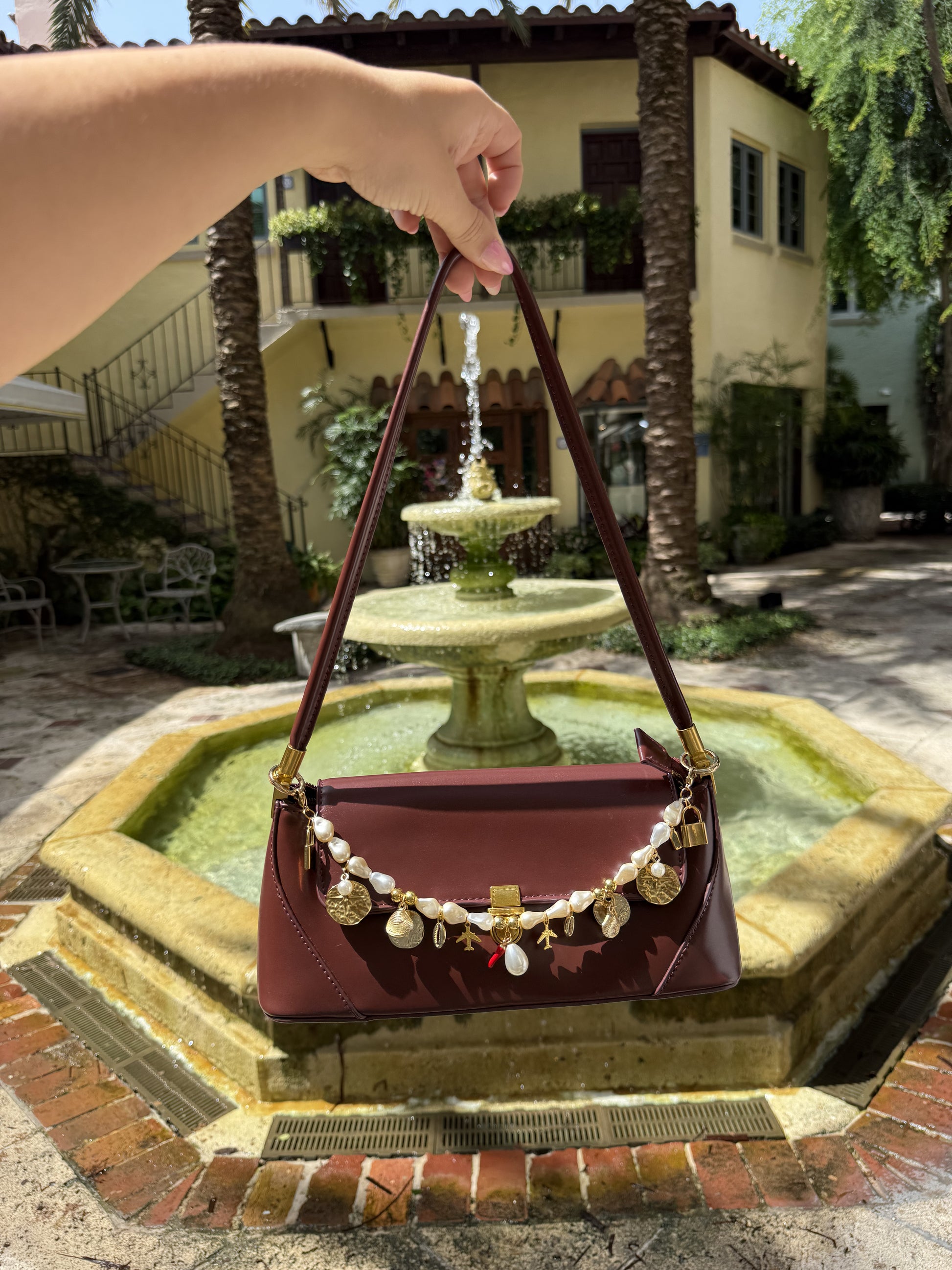 Handcrafted in Italy, this exquisite bag charm, coastal inspired statement pieces blends lustrous white pearls with a curated selection of gold-plated symbols: