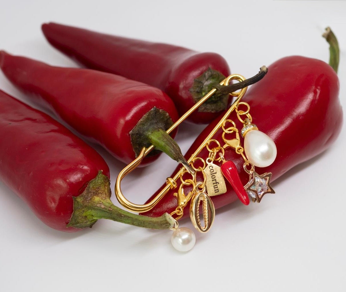 Our shoe charm that infuses every step with coastal elegance. Adorned with our signature Peperoncino, luminous white pearls, gold-plated stars, and delicate seashells, it is elegantly secured on a gleaming safety pin. With interchangeable add-ons such as a sleek plain charm and a miniature lock ~ it offers effortless, personalized versatility, elevating your everyday.